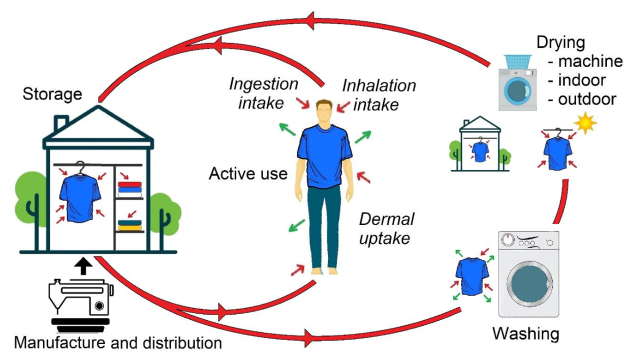 Our recent paper summarized and critically assessed evidence from 260 research papers on how wearing clothing exposes us to various chemicals and particles. While in some cases our clothing can act as a protective barrier against environmental hazards, clothing can often expose us to potentially toxic chemicals and biological particles (such as microbes and allergens) by acquiring and releasing such substances that can end up in our lungs. From the indoor environment, clothing can accumulate, for example, nicotine residue from cigarette smoke, plasticizers, flame retardants and microbes from pets and people. In occupational settings, clothing can pick up hazardous compounds used in the farming, medical and manufacturing industries. In addition to contaminants that clothing acquires from our surroundings, we should think of those that are present in clothing at the time of purchase as a consequence of manufacturing processes (e.g., dyeing, bleaching, finishing) or that have been deliberately added and are intended to be retained during the life of the garment. Some representative materials of possible concern include flame retardants, antimicrobial nanoparticles, pesticides, anti-wrinkle resins and other coating materials. Some chemicals on clothing can be chemically transformed to other species, to which we are then exposed during wear. Depending on how we use and treat the fabrics, some substances are removed through washing, drying and storage; others persist and can contribute to our exposures over the life of the garment.
