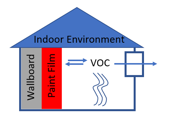 The extent to which a VOC will sorb to a paint film over time depends on a few important things: how volatile the VOC actually is, how much it “likes” the paint film from a chemical standpoint, and how quickly the VOC can move, or diffuse, into the paint film. The volatility, which is a measure of how much the organic compound likes to be in the gas phase, can be estimated from various methods established in the literature. In this work, we measure how quickly VOCs diffuse in a paint film, which correlated well with VOC volatility. This correlation allows us to predict the ways that other VOCs might diffuse in latex paint films indoors. We also show the degree to which a VOC will “like” a paint film can be approximated from the actual mass of paint present in an indoor environment. This is useful from a modeling perspective, because paint mass in a modeled environment can be determined by the surface area of the painted walls and thickness of the paint film.